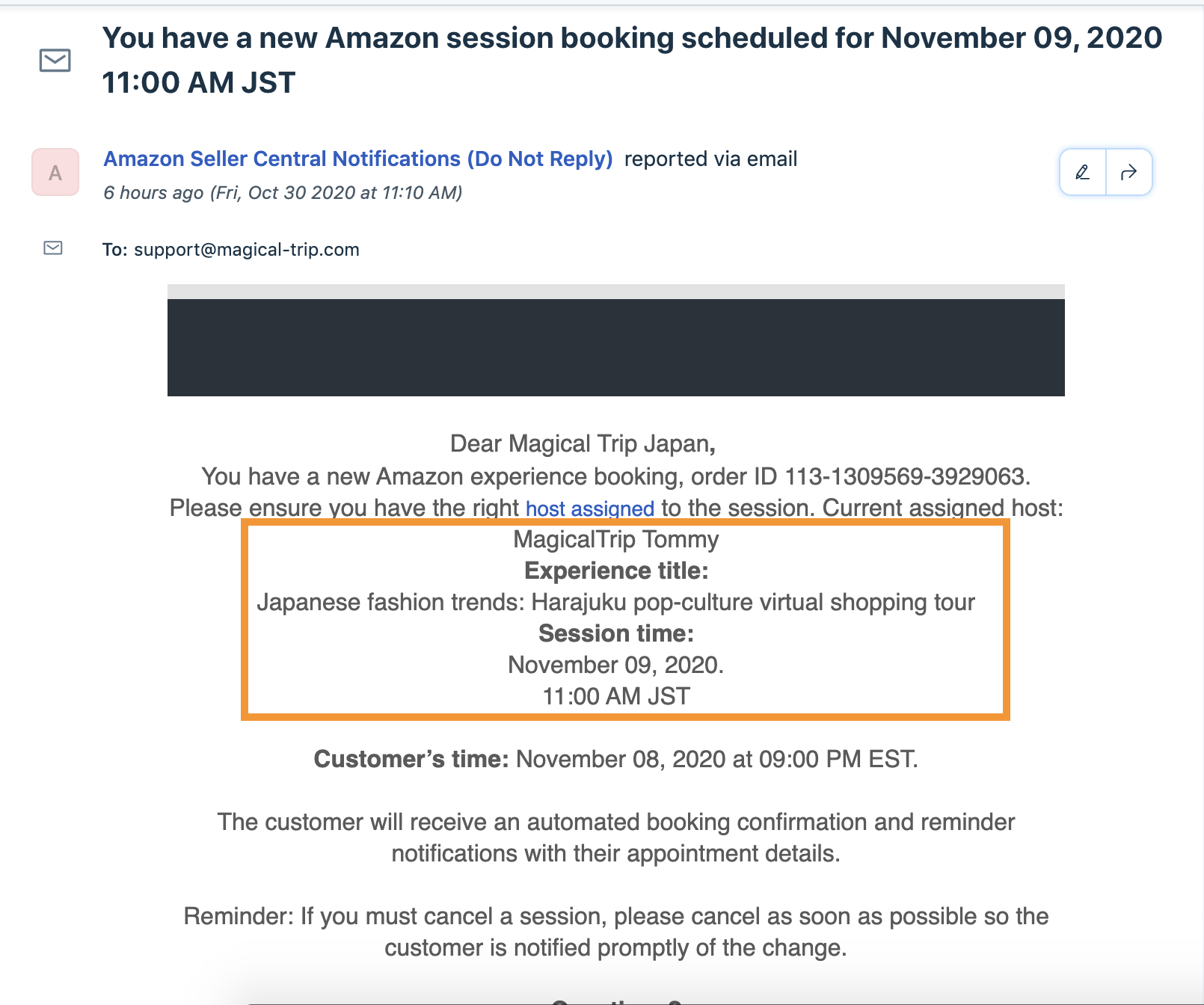 Details: 「You have a new Amazon session booking scheduled for 〇〇」
