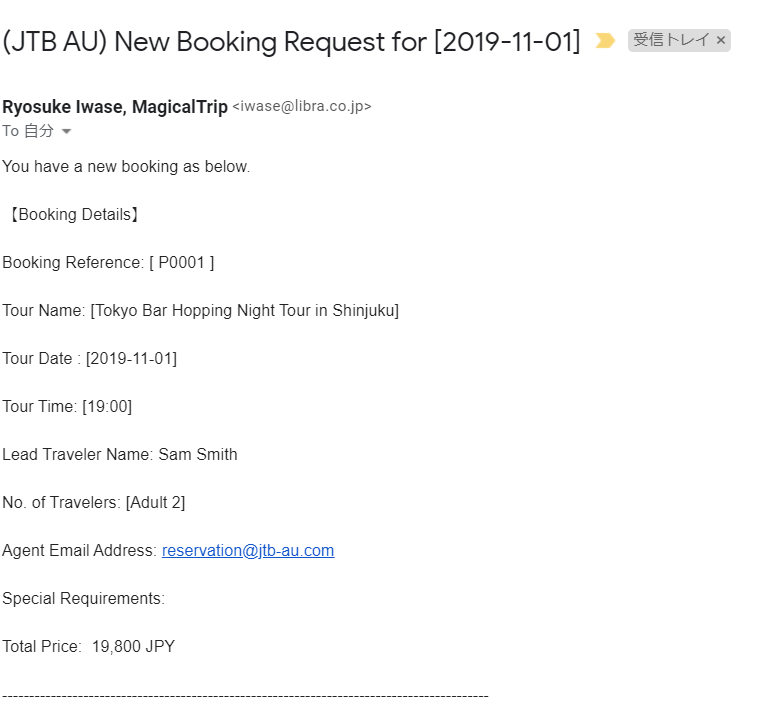Beauty-of-Japan-Tours(Adding flow is the same as other OTAs) Add a customer name to the agent email addressand put it in the customer emailaddress field (ef. clement_k.au@bojt.jp -> clement_k.au+CUSTOMERNAME@bojt.jp)- Calculate the paid amount with this fomula