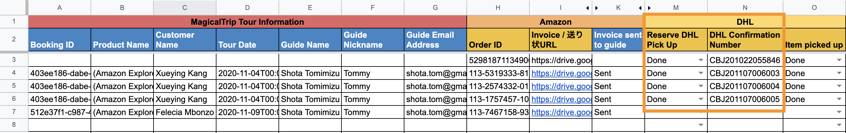 • 8-4: Change the Reserve DHL Pick Up in column M in Amazon Tour_Item Shipping to Done
